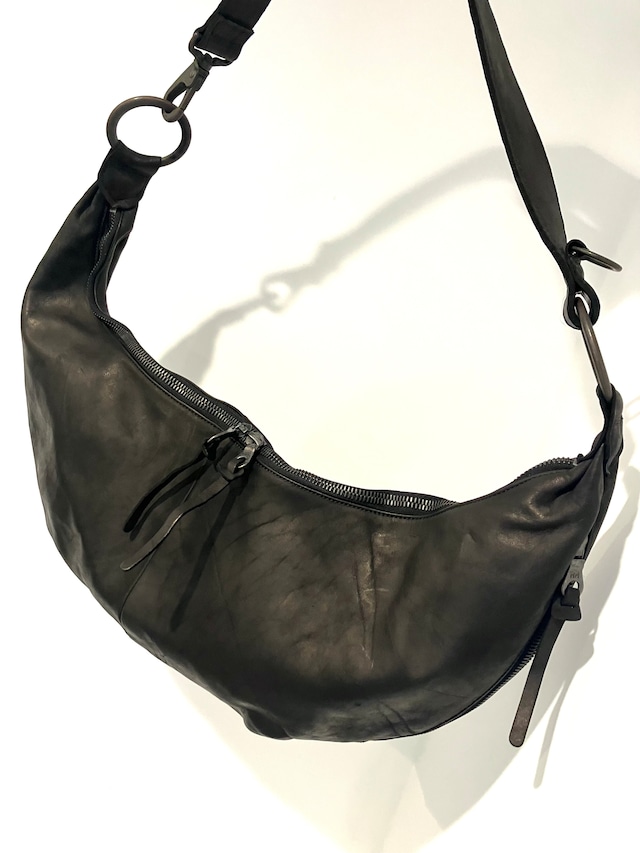 BACKLASHのバッグコレクションの中でも特にブランドを代表する通称"バナナバッグ"。 デイリーユースするアイテムであるからこそ一層機能性を追求。湾曲した独自の造形による身体へのフィット感が絶妙です。ショルダーストラップを2段階で調節することが可能です。 イタリアGUIDI社製オイルカーフレザーを使用。 きめ細やかな質感、オイルがたっぷりと含まれていることを感じることのできるしっとりとした手触りが魅力。柔軟な質感に反したしっかりとハリとコシのある皮革は、使用に伴ってアジのあるエイジングを期待頂けます。この皮革の醍醐味でもある裏面の綺麗な表情を活かし、裏地をは敢えて配備していません。 No/ 143-01 Material/ Guidi Calf Leather (牛革) Color/ Black SIZE/ F:縦 約29cm / 横 約40cm / マチ 約14cm ※傷の少ないものを選んでおりますが、天然の革を使用しているため、個体差(シボやシワの入り方)、革本来の傷(生体時に付いていたもの)などはございます。それはつまり本革、天然である証でもあります。不良品、キズ物としてのご返品はお受けできませんので、以上をご理解頂いたうえでご購入ご検討くださいませ。