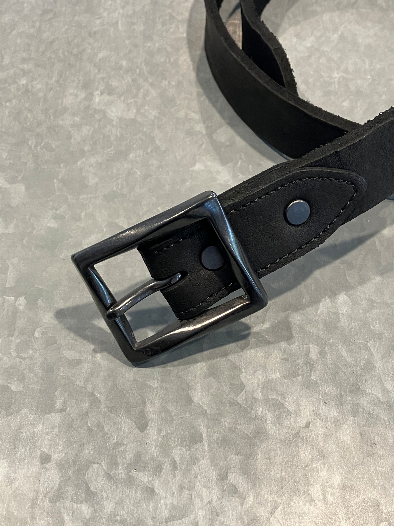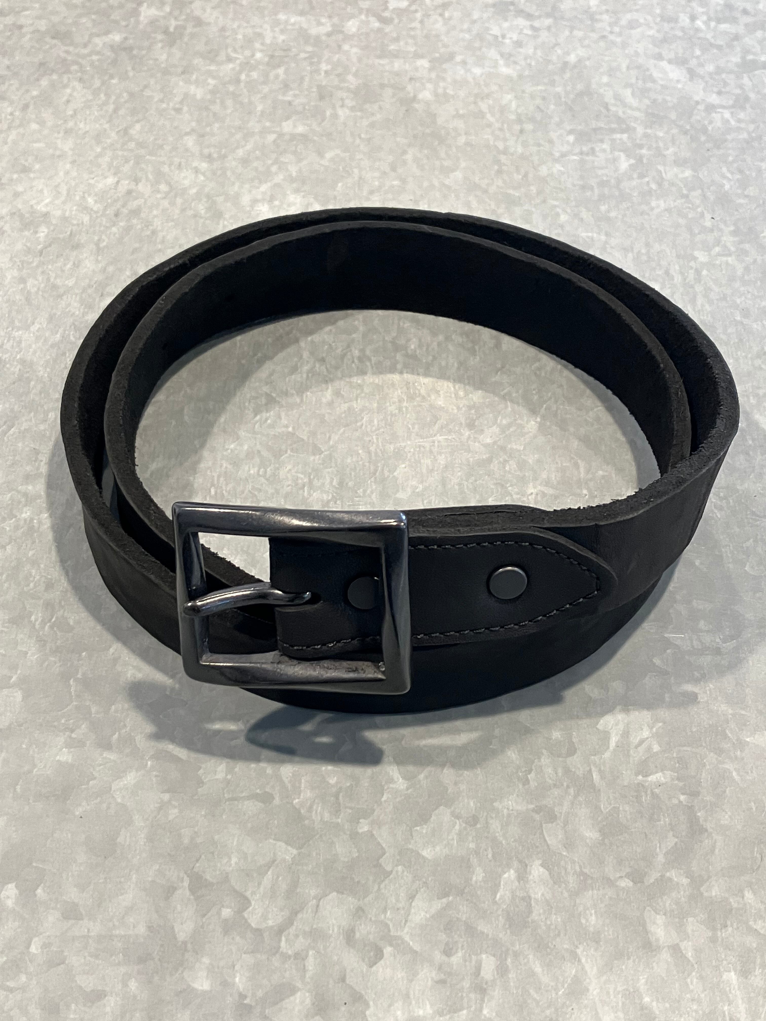 荒さを持った迫力のあるダブルショルダー製品染めベルトシリーズの中で、これまで展開のなかった30mm巾を新たに展開。40mmや50mmと比較すると細巾の印象ですが、革の表情も加わり十分な存在感を感じていただけます。形状はシンプルなものの適度な重厚感をもたらす真鍮製スクエアバックルを装着したベルトになります。