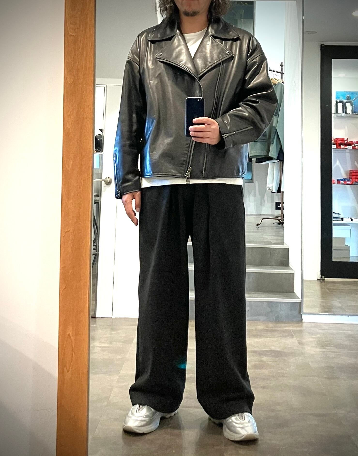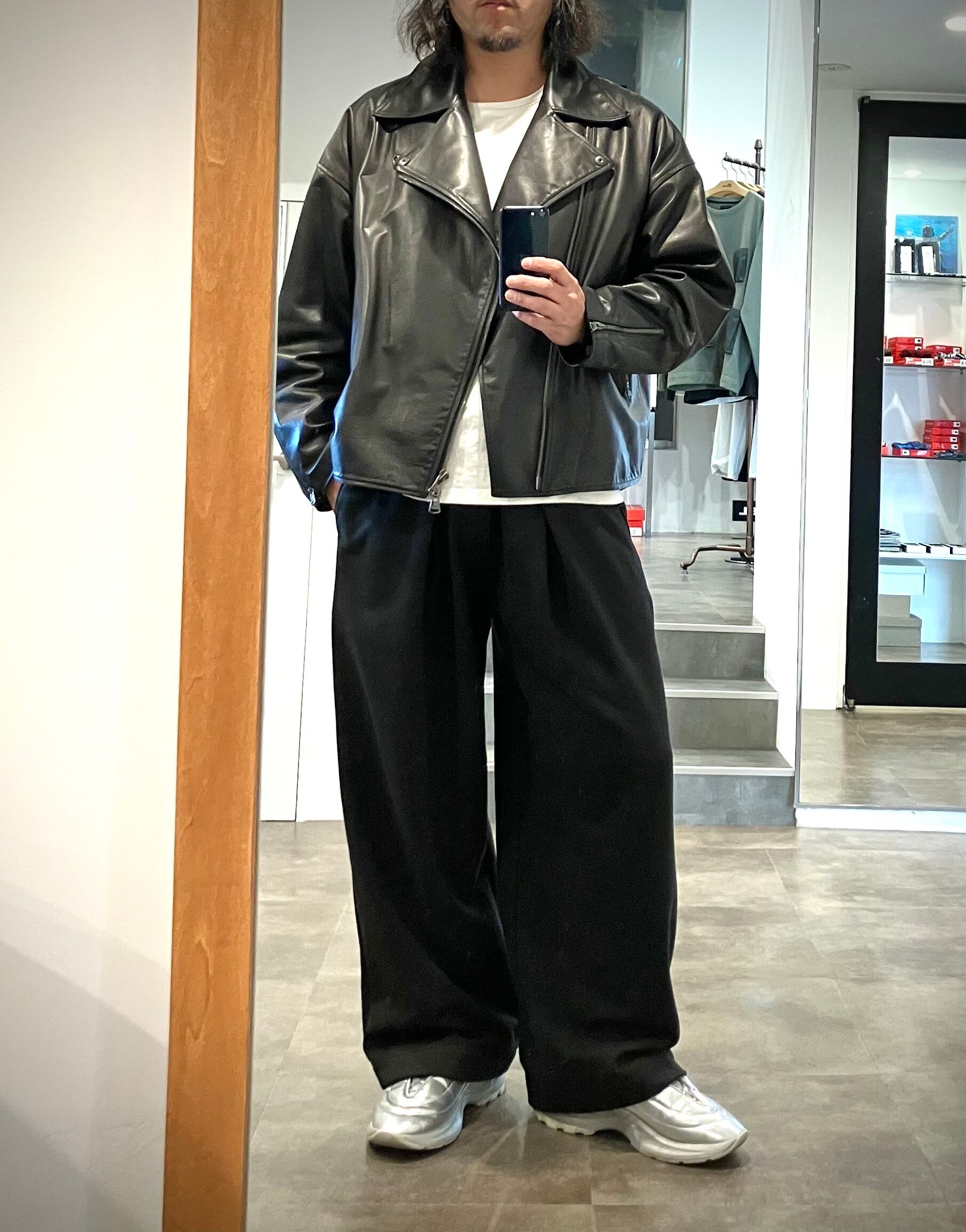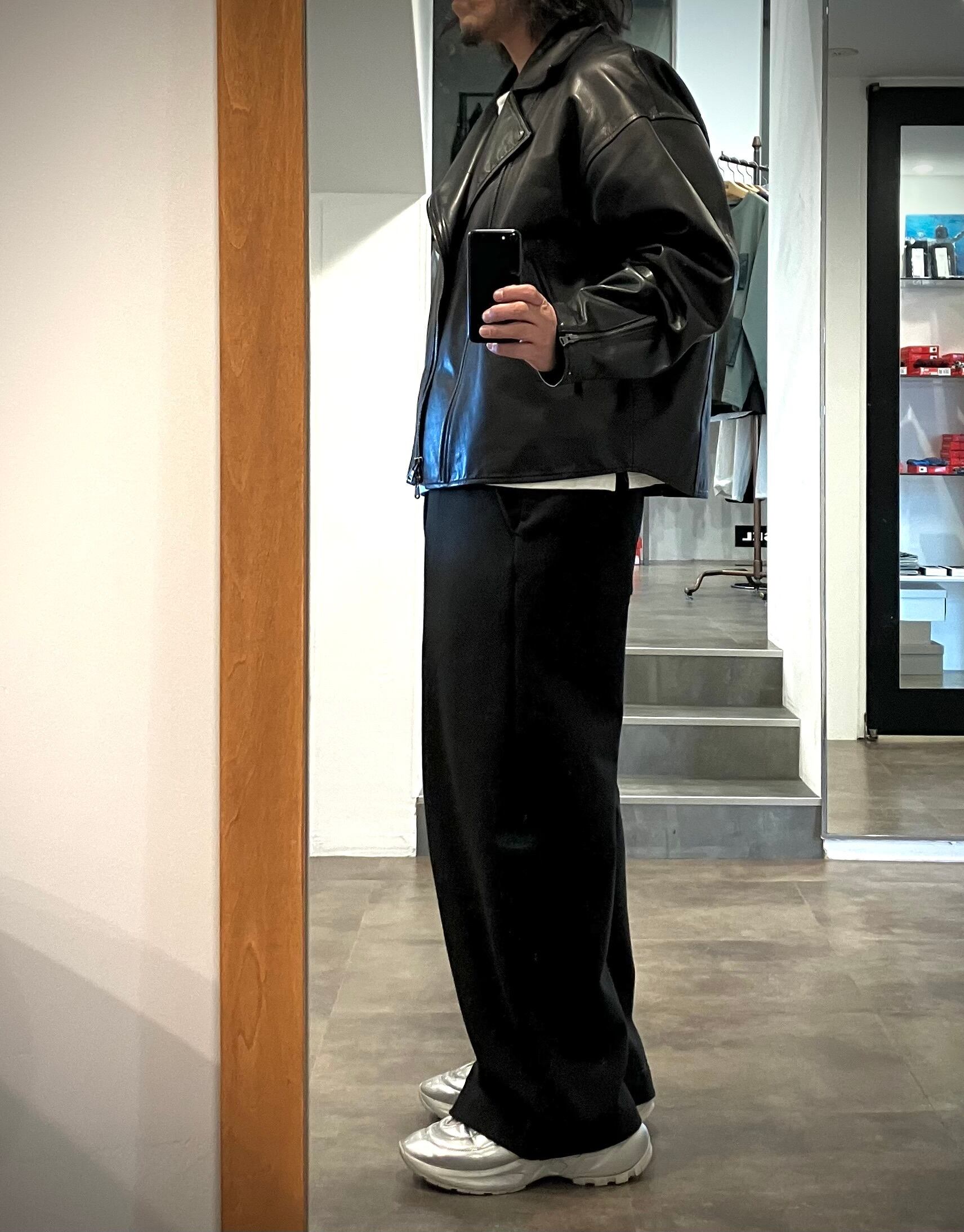 着用していただけるとわかりますが、ラフな素材感でありながらいわゆるスウェット地には見えない、スラックスのようなきれいなワイドシルエットを体感できます。